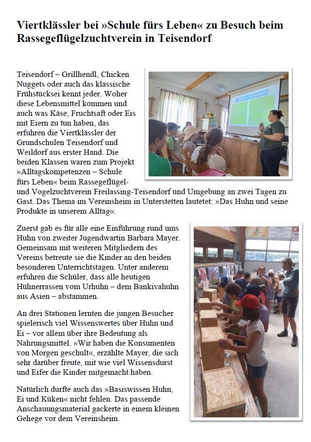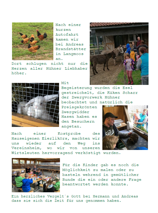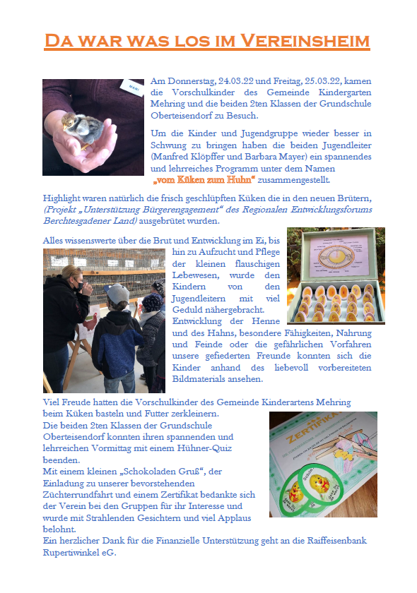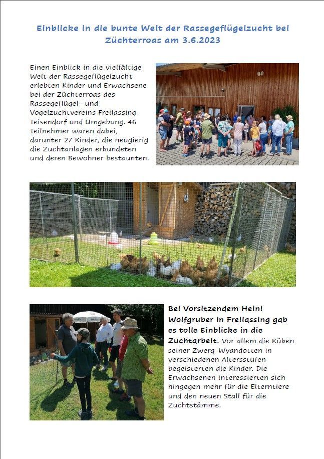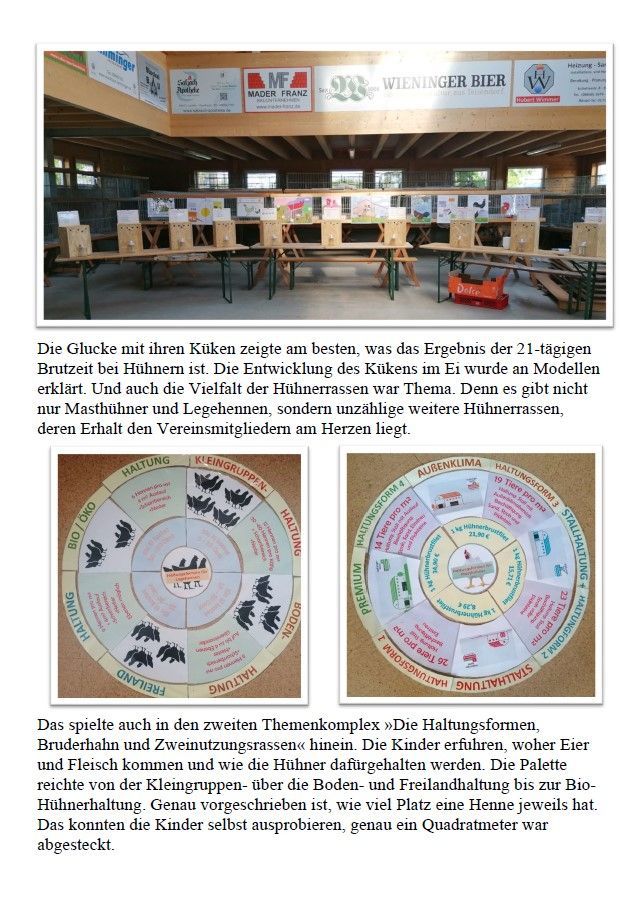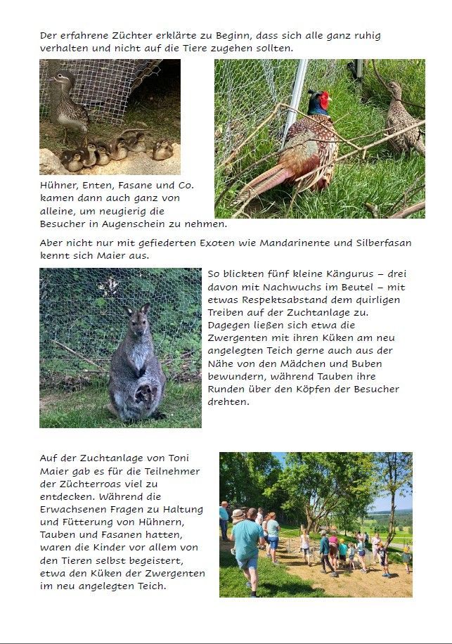 Gerade wenn jemand neu mit der Rassegeflügelzucht beginnt oder sich eine neue Rasse zugelegt hat, sind diese Tipps sehr hilfreich. Aber auch so mancher »alte Hase« konnte sein Wissen durch die Hinweise von Hans Trinkl noch vertiefen. Bei den Kindern und Jugendlichen verstand es Wilhelm Bauer hervorragend zu vermitteln, worauf sie bei der Zucht achten sollten. Dabei hatte er viel Lob für die Mädchen und Buben sowie ihre Tiere.