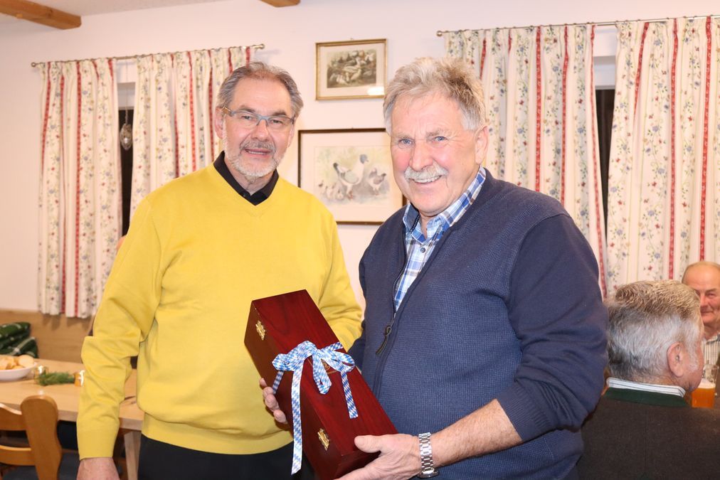 »Ich würde meinen Hut ziehen, wenn ich einen hätte«, würdigte zweiter Vorsitzender Heinrich Burghartswieser treffend die Leistungen des Geehrten. »Wir hatten ja überlegt, Dir einen Flug nach Ibiza zu schenken. Aber bei all den Tieren bei Dir daheim, bräuchten wir ja zwei Hofhelfer, solange Du weg bist.« So gab es eine Holzscheibe mit darauf gemalten Zwerg-Wyandotten, die Wolfgruber seit Jahren erfolgreich züchtet. Und auch als Züchter von Böhmentauben feiert der 73-jährige Freilassinger regelmäßig Erfolge. Diese Tauben waren auf einem großen Holzschild eingebrannt, das er von den befreundeten Jugendleitern vom Geflügelzuchtverein Miesbach erhielt, die zugleich die Glückwünsche des Kreisverbands Rosenheim mitbrachten. Auch dort engagiert sich Wolfgruber seit vielen Jahren im Vorstand.